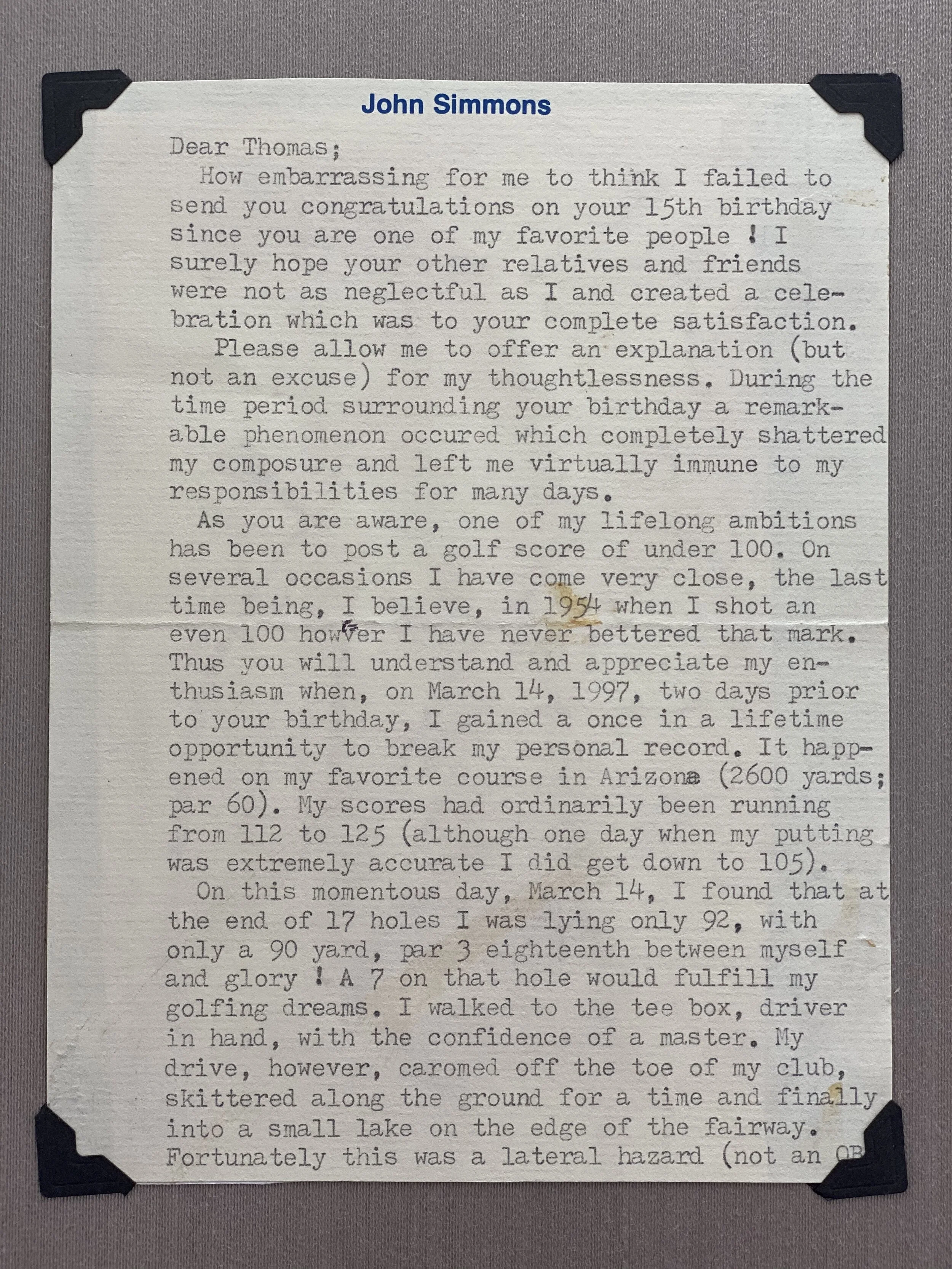 One winter day he realized he had forgotten about grandson Thomas’s birthday. Dad was a clever, funny and frequent writer of poems and stories. Horrified at the oversight he penned the following letter:
